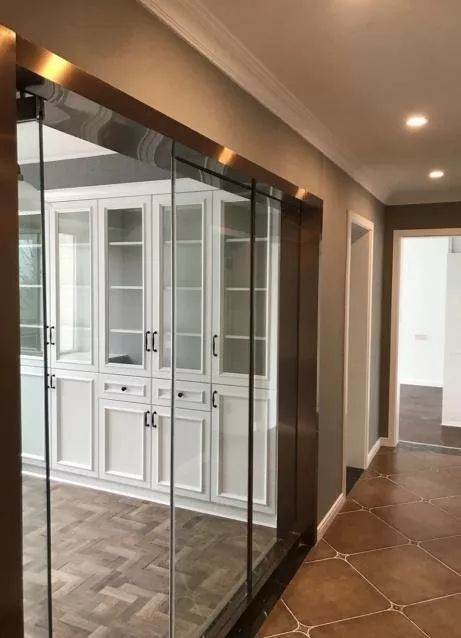 书房最接近过道的区域,为了保证过道的采光以及通透性,我们就给书房的门洞扩大,改造成了一个玻璃门的模式。