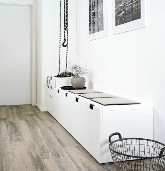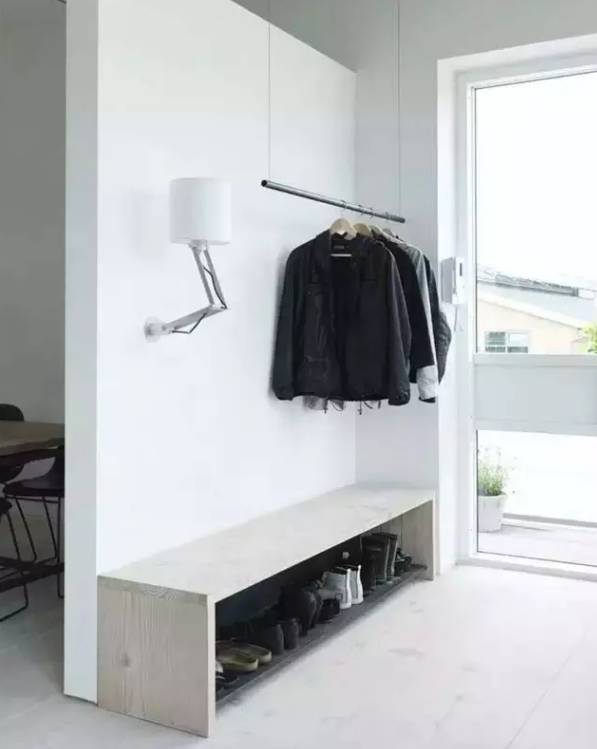 纯白色的鞋凳衣柜组合设计,让这个家看上去简单大方,更具现代感,并提供了更多的收纳空间哦!