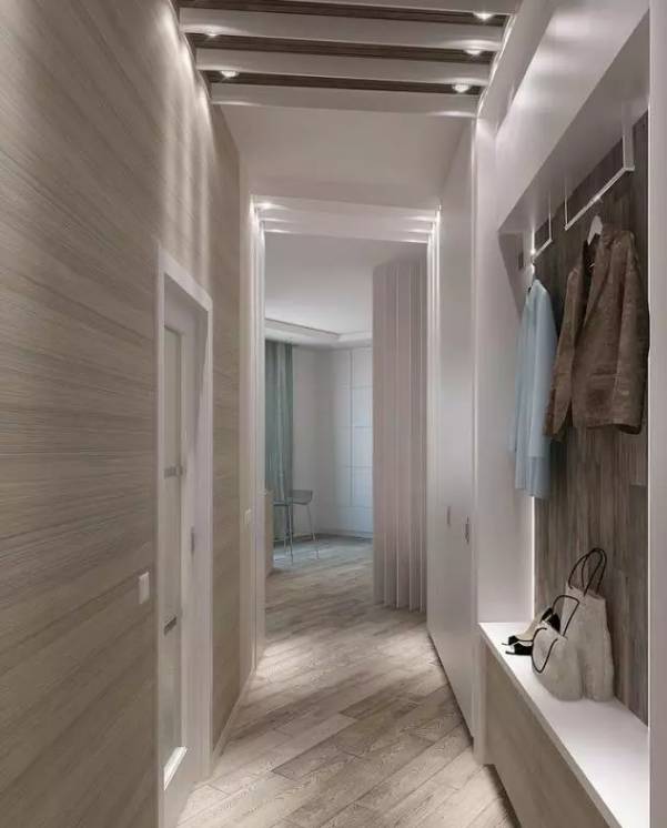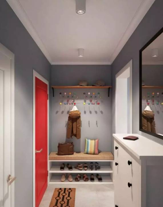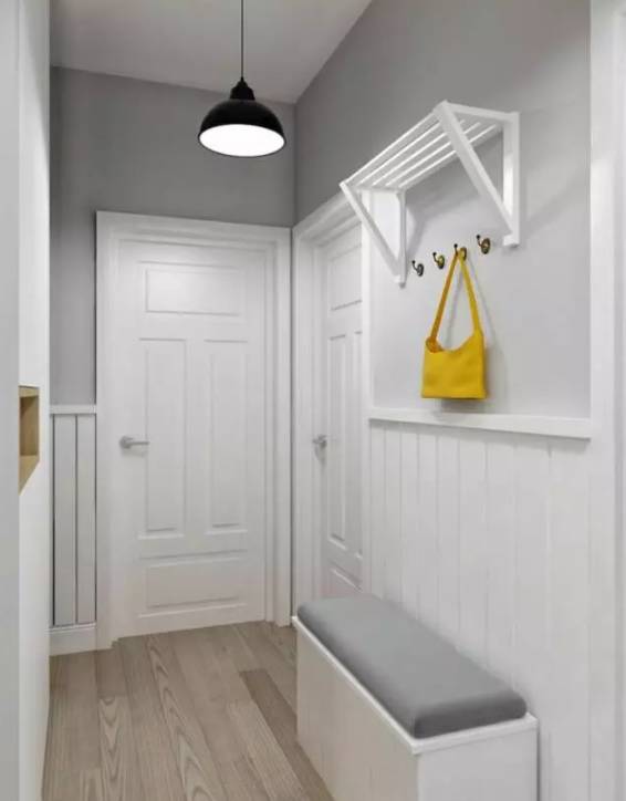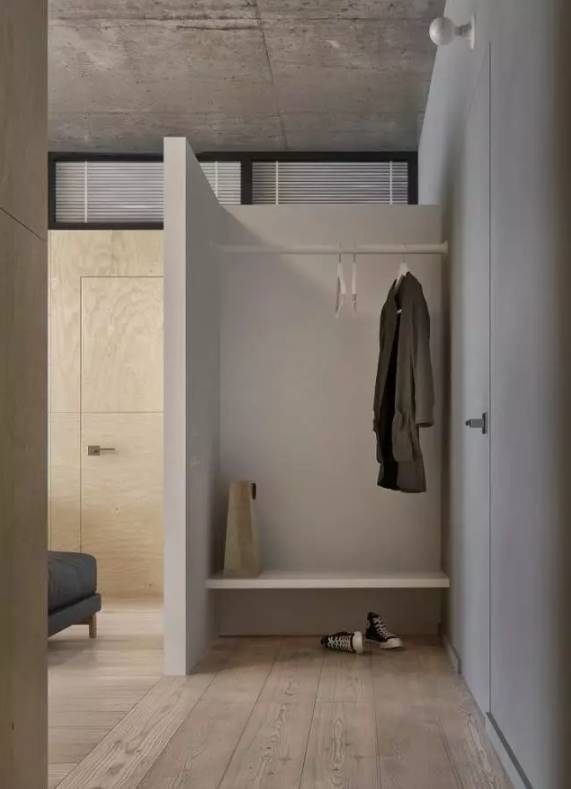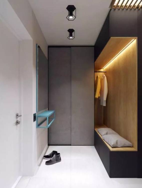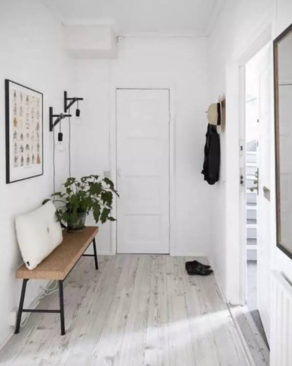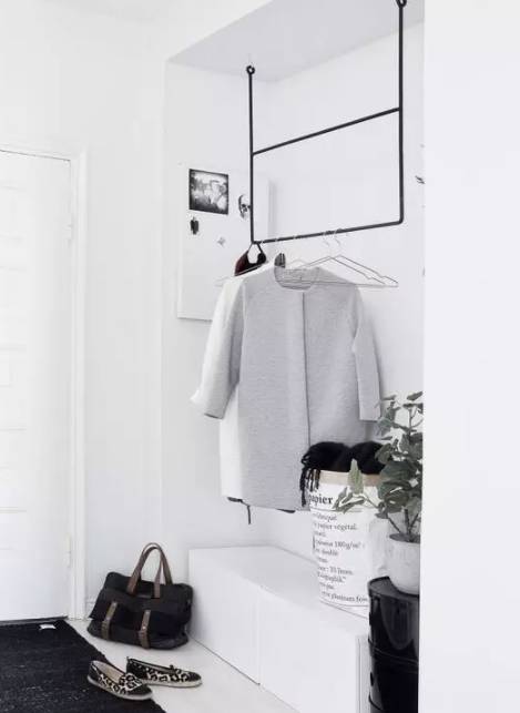 如果门厅空间实在有限,或者你觉得装修太费事了,就摆上一张简洁的换鞋凳吧,再在墙上钉上几个挂钩或者置一面穿衣镜,小小衣帽间也能轻松搞定。