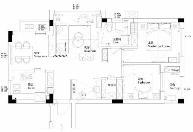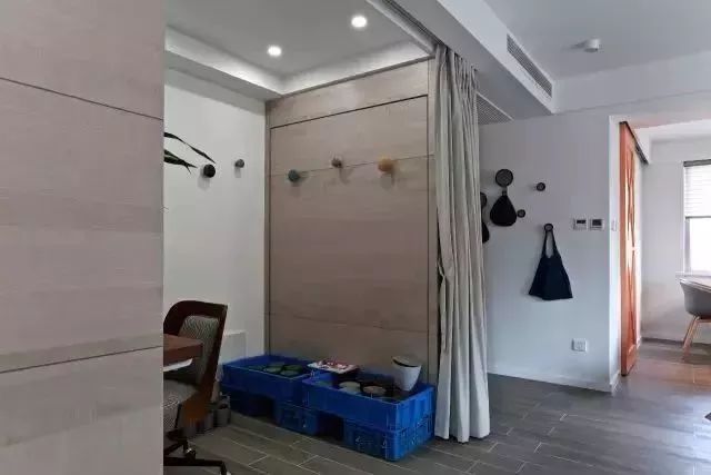 89㎡小三房,原本入户门打开的右边是餐厅,但是业主似乎并不满意这样的格局,所以把餐厅及书房的位置对调,让厨房与餐厅更近,而且靠窗摆放的餐桌,让整个空间增加了光线;其次,书房的设计则采用壁挂床,可根据需要灵活变动,平时作为书房,若有客人来的则化身为客卧。