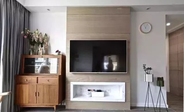 电视背景墙,中间凸出并内嵌壁龛作为电视柜,左边是原木色收纳柜,右边则摆放两个三角花架的绿植,虽简约但很有味道。