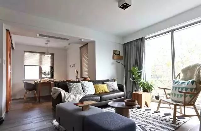 89㎡小三房,原本入户门打开的右边是餐厅,但是业主似乎并不满意这样的格局,所以把餐厅及书房的位置对调,让厨房与餐厅更近,而且靠窗摆放的餐桌,让整个空间增加了光线;其次,书房的设计则采用壁挂床,可根据需要灵活变动,平时作为书房,若有客人来的则化身为客卧。平面布置图客厅由客厅的大落地窗看向外面,树上的