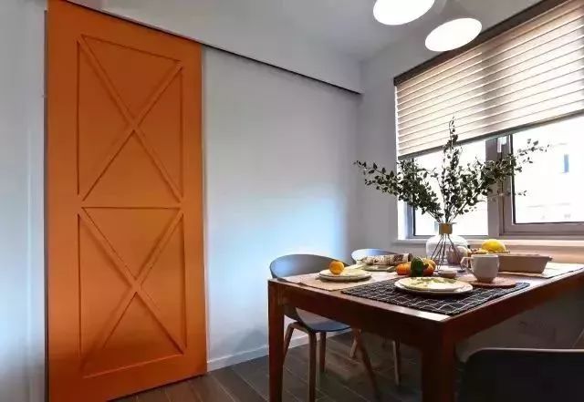 原木色的餐桌,搭配时尚简约的餐椅,同时餐桌上面搭配了餐垫,细小的布置,让就餐变得很有情调,橙色的谷仓门提亮了空间,门后面即是厨房。