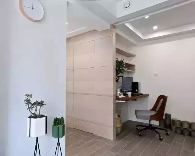 客厅看向书房方向,悬挂式的书桌,虽然外观简洁,但是却很实用。