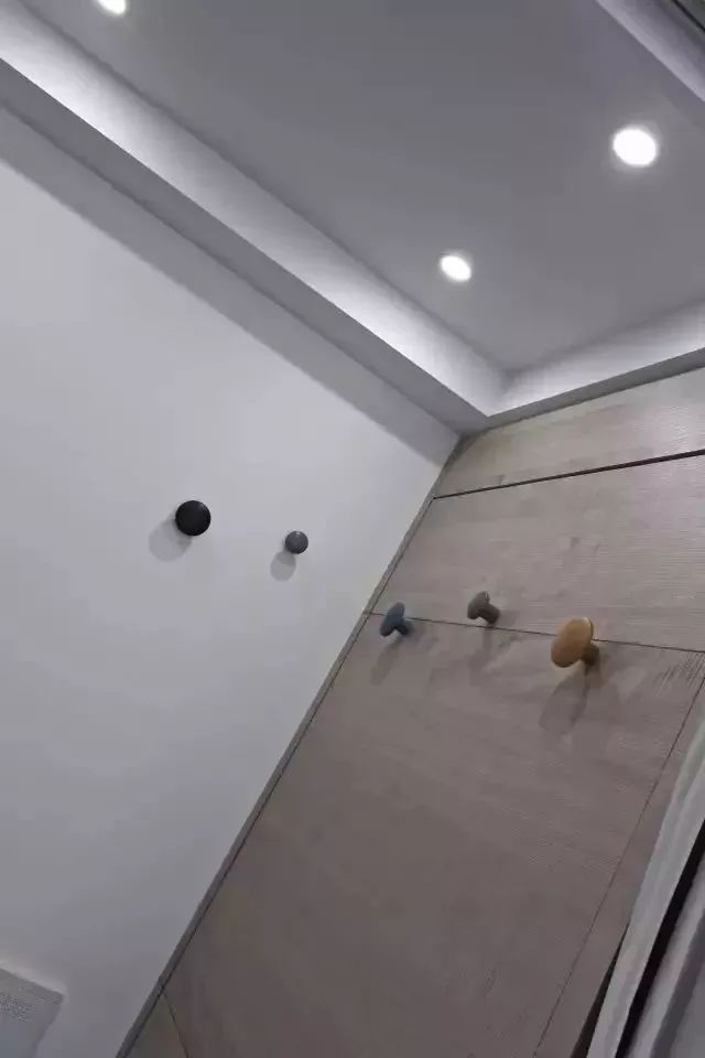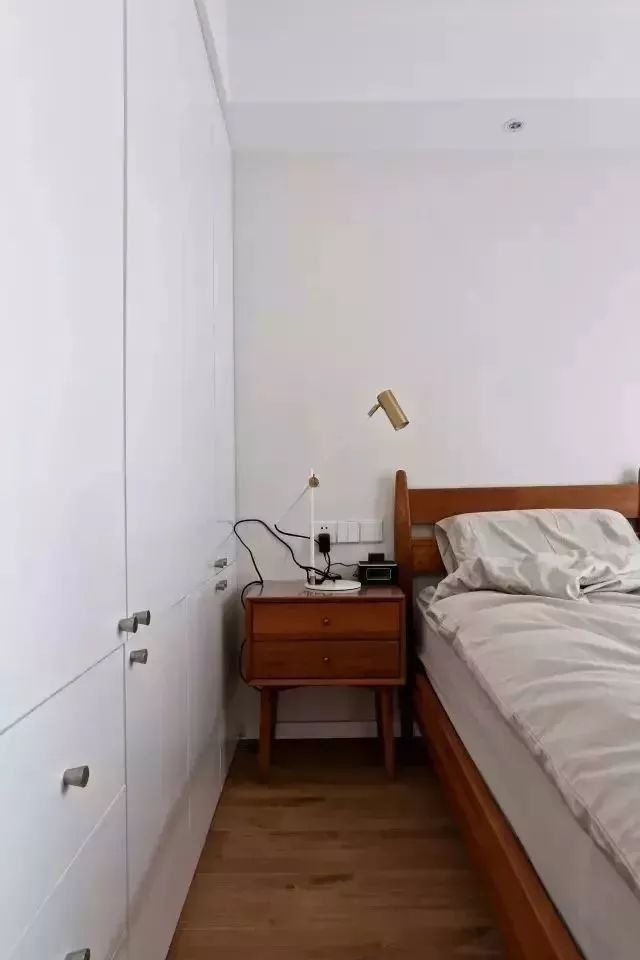 主卧,顶天立地的白色掩门衣柜,与墙面融为一体,若没有衣柜的拉手,也许很难看出是个衣柜。