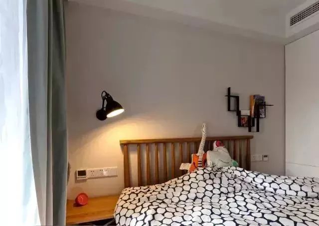 次卧采用格栅式的床及原木色的床头柜,搭配波点床被,床头背景简单到只有一盏壁灯及隔板置物架,可是呈现出来的效果却很具有卧室该有的温馨感及设计感。