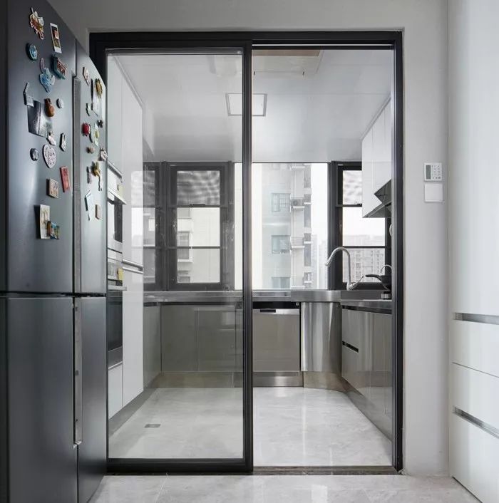 根据厨房结构把老式木门改成滑门或者折叠门,轻松空出门后面的空间;或者选择靠门的墙边向上下挖出合适的空间来做储物空间,比如吊柜。