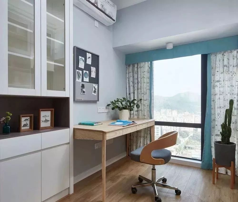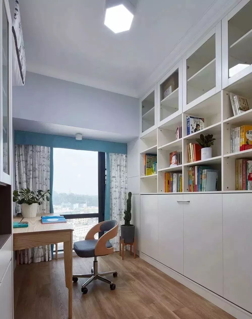 书房在客厅的右手边,大大的落地窗,视野还蛮开阔的。喜欢这样的布局和搭配,让人觉得很舒服。