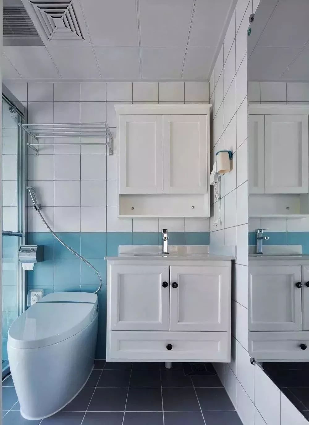 蓝白搭配的墙砖,灰色的地砖,米色的收纳柜,镜柜、还有弧形玻璃门隔断,布局较紧凑,保证了日常基本需求。