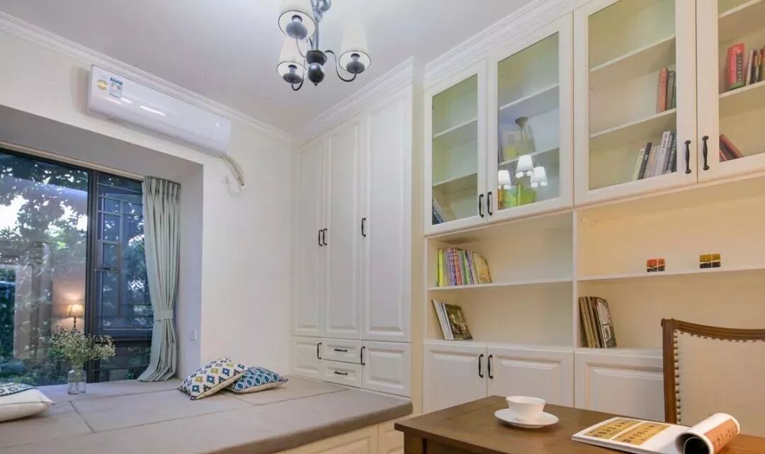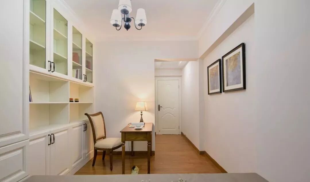 以白色为基调,简约大气,书房独立于一方空间,温馨静谧!旁边一整排到顶的书柜满足了主人的藏书需求。