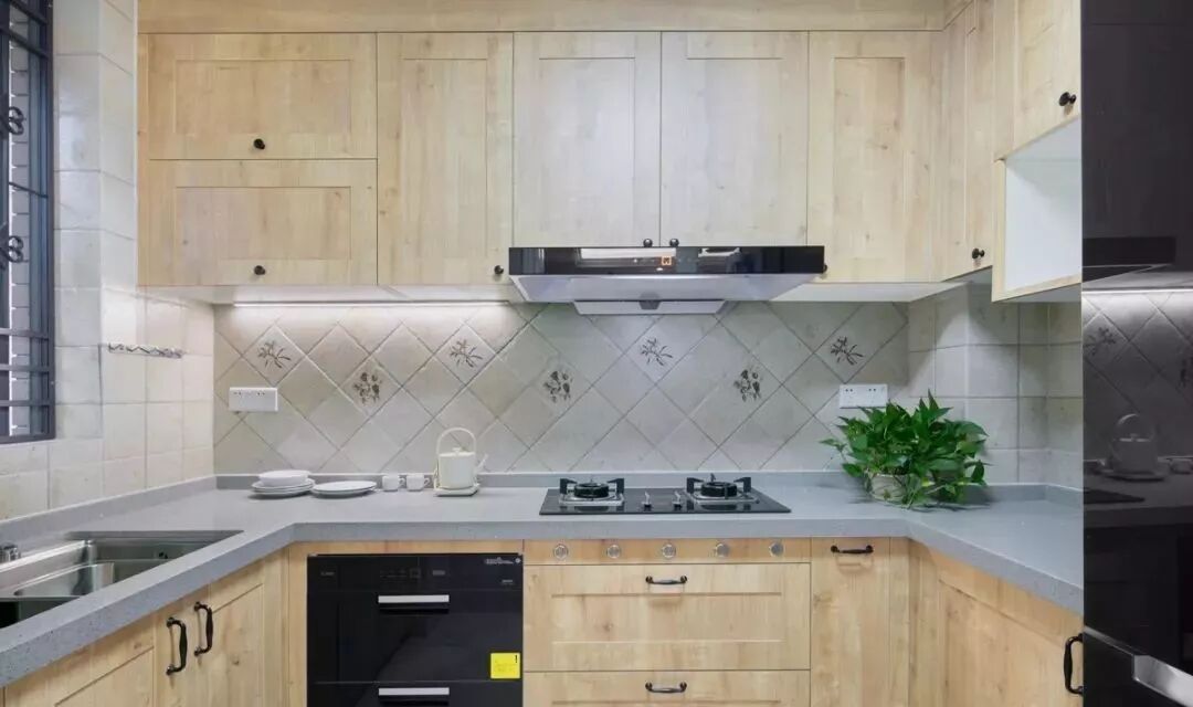 原木色橱柜+浅灰色台面,简洁大气,质感满满;原木色,带来温暖自然的生活气息!水槽设计在窗户下方,采光更加充足!
