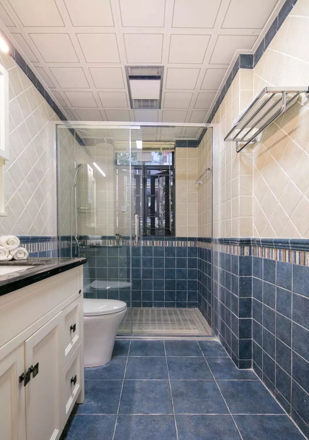 次卫米色瓷砖+蓝色瓷砖拼接,很有格调!