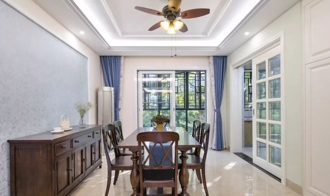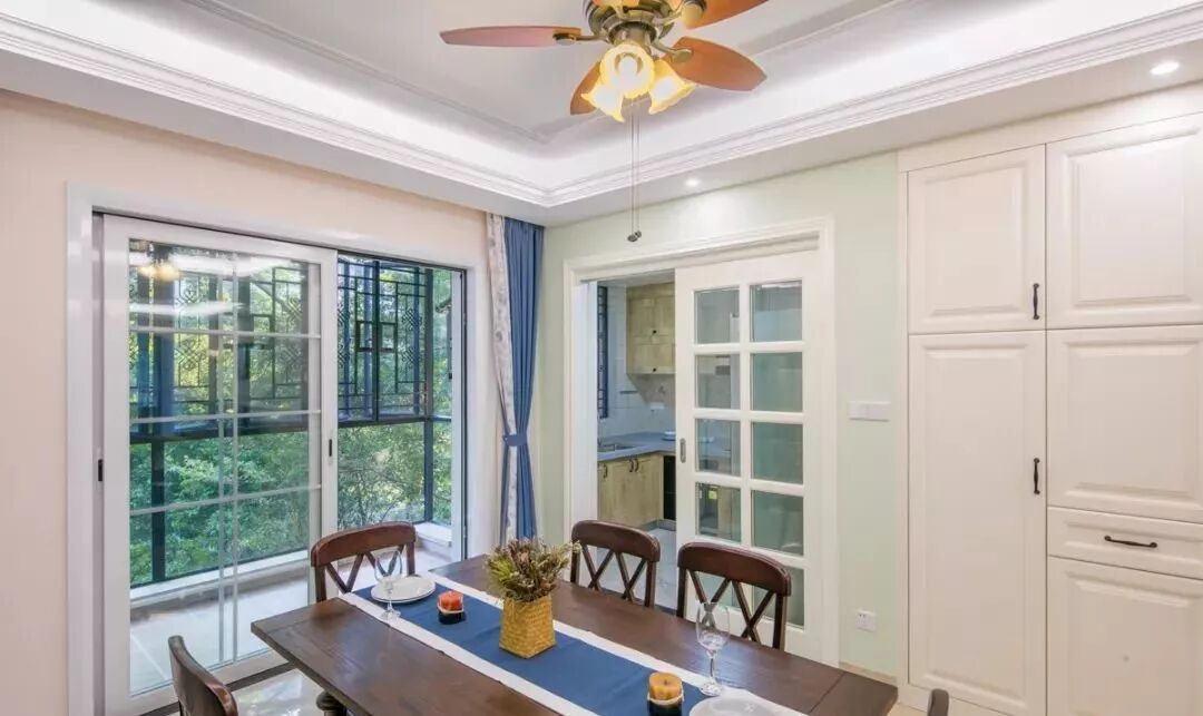 透明玻璃推拉门带来开阔通透的视觉感,让窗外的景色成为室内的背景。吊灯电扇一体设计不仅实用,更别具一格!