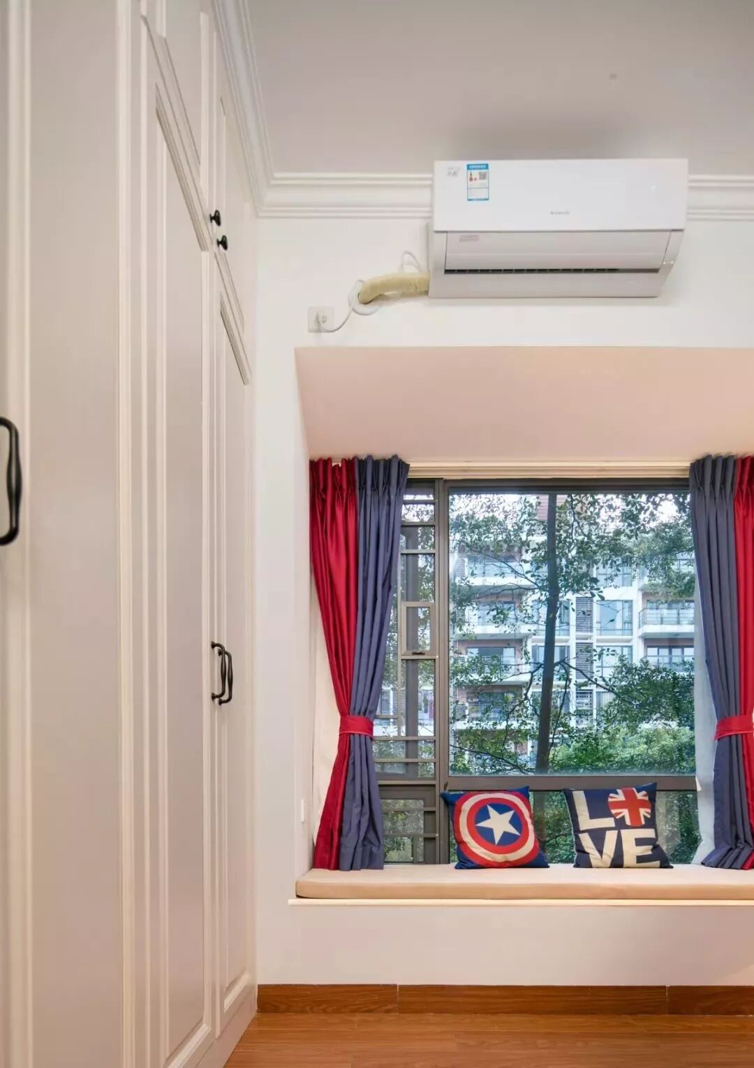 英伦风床品及窗帘,给房间增添了不一样的色彩。衣柜的侧面留出了开放式的隔层,可以用于收纳玩具。