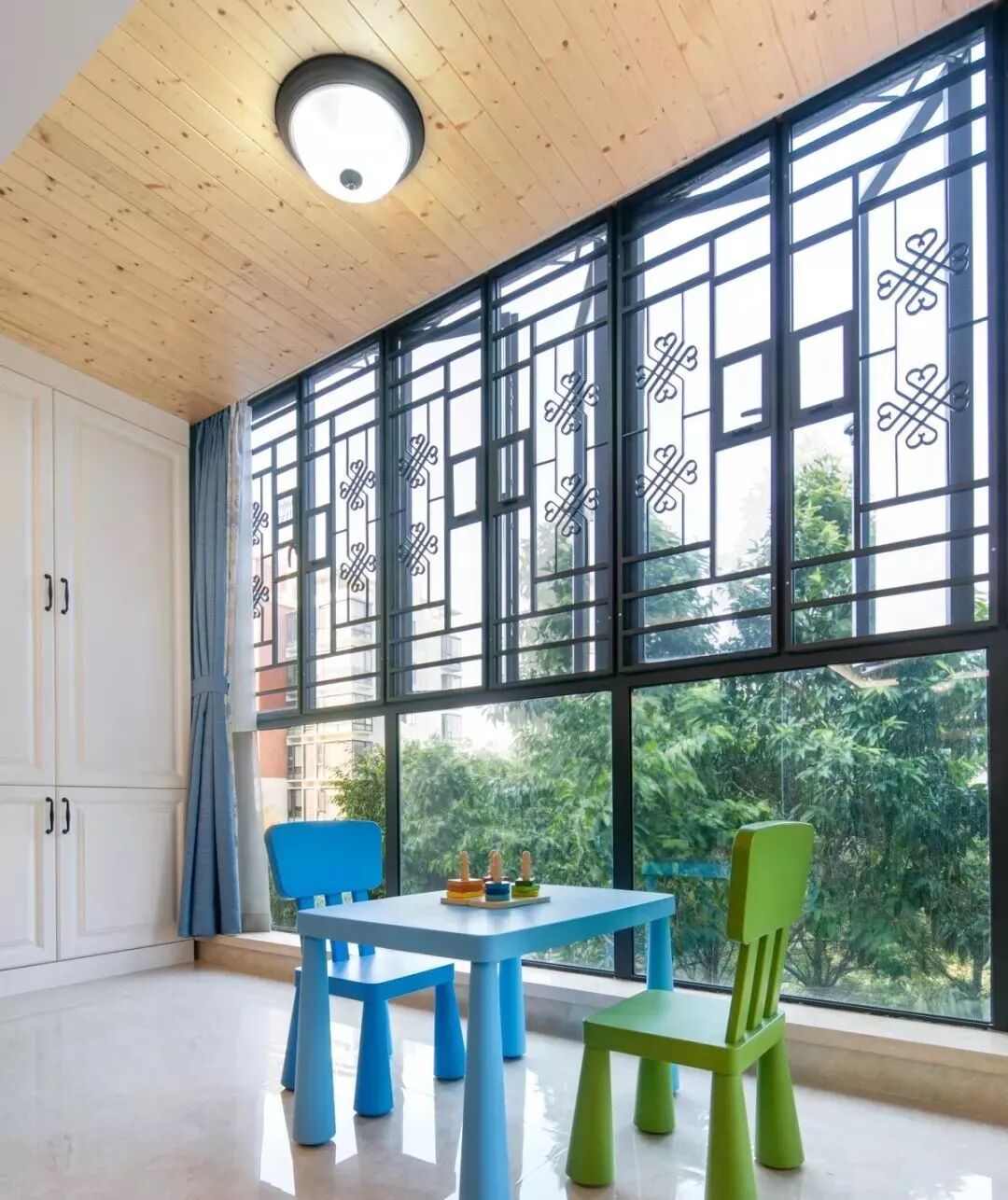 阳台纳入客厅,旁边设计了白色衣柜,实用又美观;两把小椅子,给孩子玩游戏准备了充足的将空间,同时也能将窗外的美景尽收眼底。