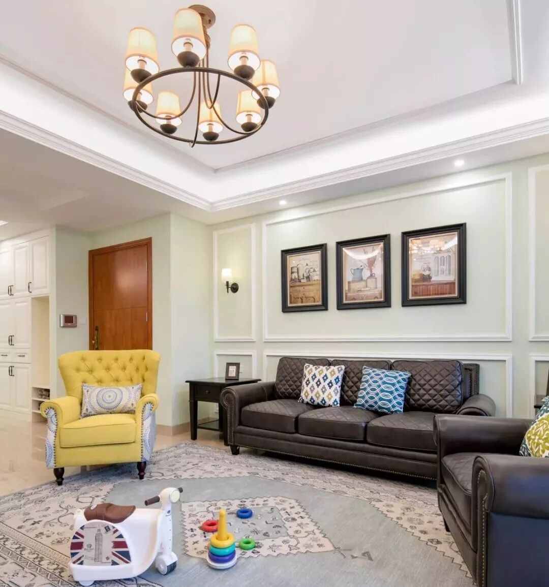 沙发与背景墙深浅色的搭配,丰富了空间的层次感。整体给人一种清新休闲又不失品质的感觉。取消茶几,方便孩子玩耍!