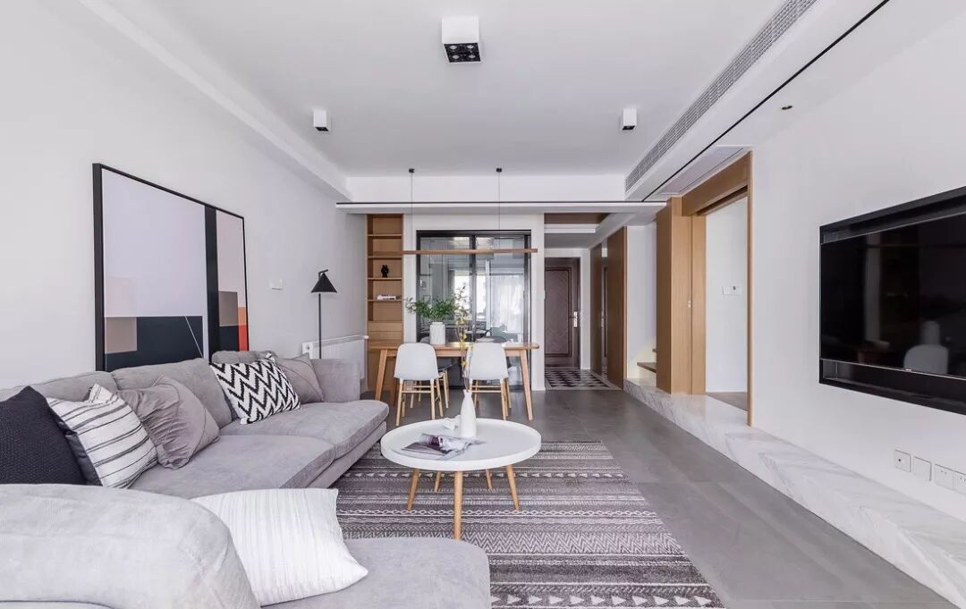 白色天花与墙面地面颜色形成层层递进的空间感,客厅没有主灯,简约的射灯+灯带格局,符合整体时尚气质。