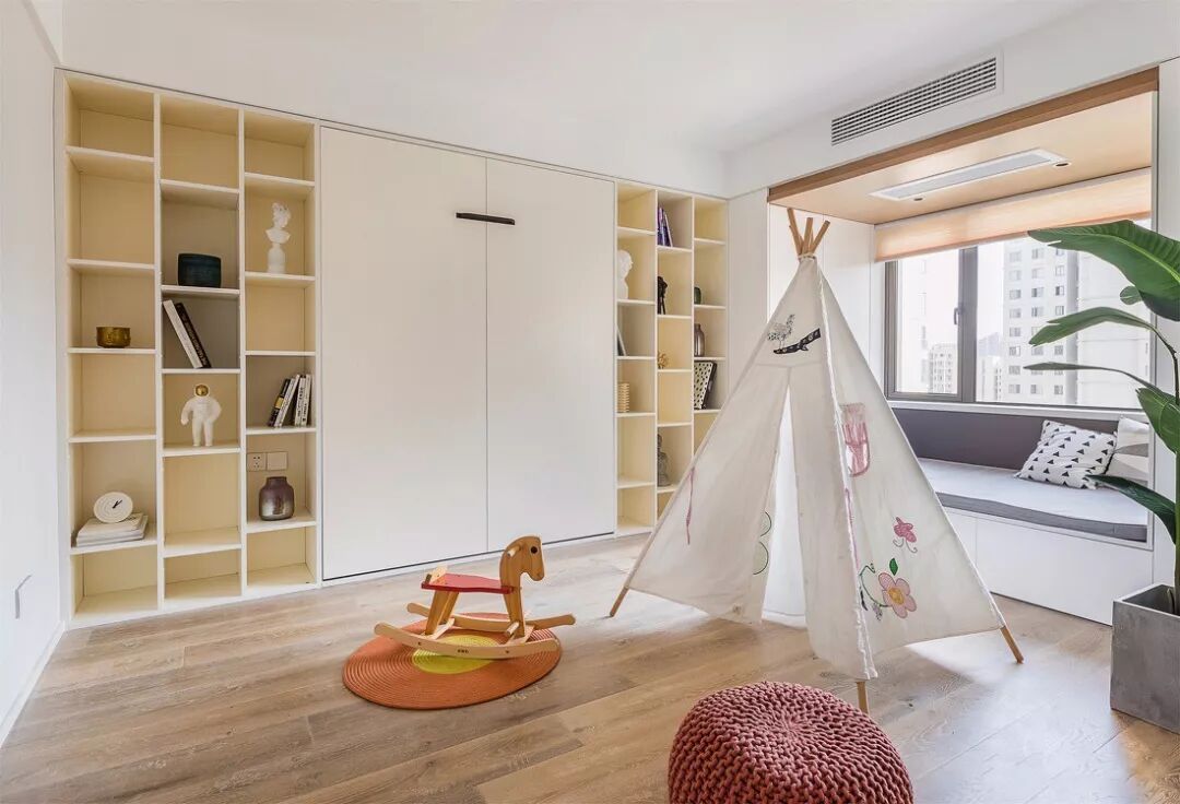 ❶孩子小的时候,摆上玩具和小帐篷,变成亲子互动区。