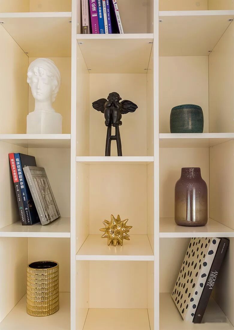 ❸墙面两边安装多格子书架,满足不同的收纳需求。