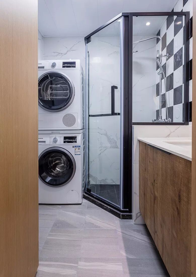 将洗衣机和烘干机同时塞进卫生间,利用转角淋浴房做好了干湿分离。