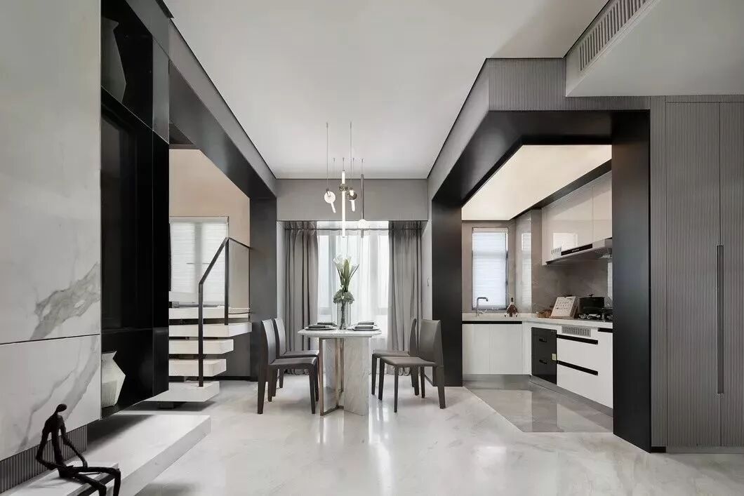 每一种材质都有着自己特有的肌理、色彩和节奏,之间潜藏的色调深度层次,让空间充满动态感。发挥结构构成本身的形式美,以黑白灰主导了一场思维的立体结构和多维度的空间概念。