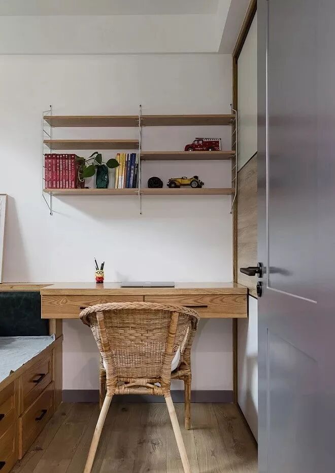 木工现场制作的书架,为了保证牢固度和榻榻米的靠背做成一个整体,书架是成品的书架,书桌右侧是一个移门衣柜。