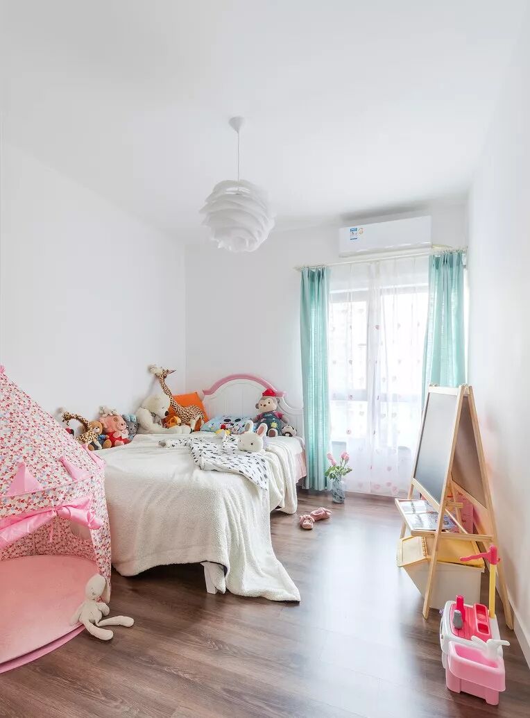 儿童房大量留白,利用窗帘、玩偶、室内帐篷以及画板等,为整个房间填充可爱俏皮的童真元素。