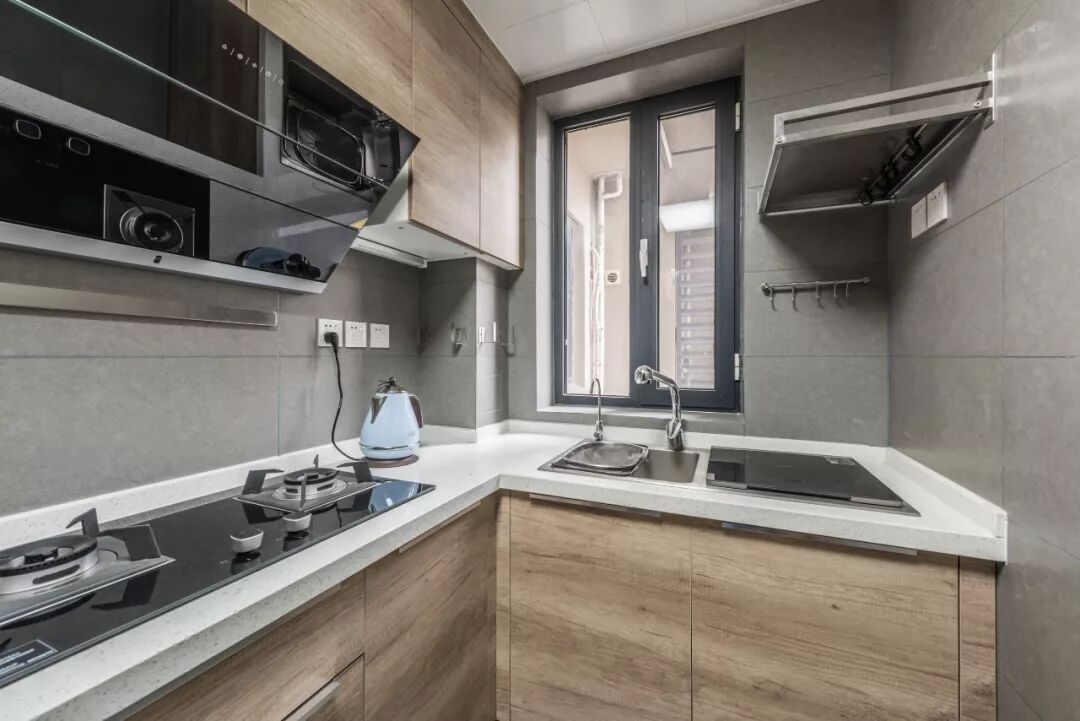 厨房延用原木风格,提高空间的质感。虽然厨房面积狭小,但功能齐全。