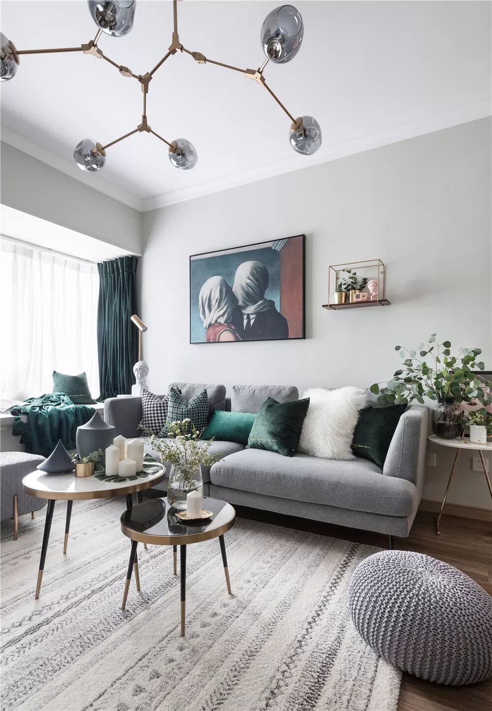 客厅以灰白两色为基调,辅以墨绿色细节软装,营造简约而又精致的复古气息。