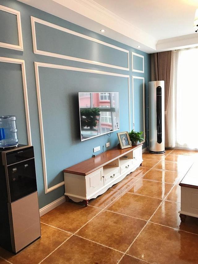 湖蓝色电视墙,再走上一圈石膏线做装饰,搭配仿古地砖,自带复古气质,美式风格妥妥的。