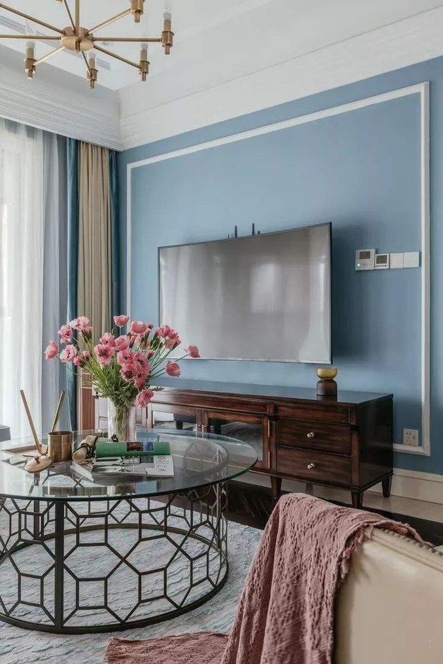 天蓝色的电视墙,让整个客厅变得明媚起来,搭配做旧电视柜以及玻璃金属茶几,既有历史韵味,又有现代时尚感。