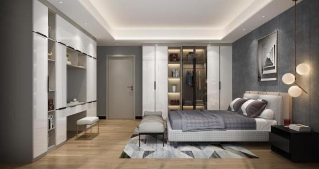 卧室利用墙体空间设计白色衣柜、储物柜等收纳空间,嵌入式一柜到顶的设计与墙体融为一体,节省面积的同时空间更为简洁高级。