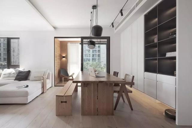 自然原木色橡木餐桌及长凳,传统打家具的概念植入空间,保留原有阳台移门及阳台。餐厅外的阳台,划分为了设备阳台和休闲阳台,原木色护墙板装饰与落地窗之外的大自然形成呼应,呈现自然悠闲、自在舒适的休憩之地。