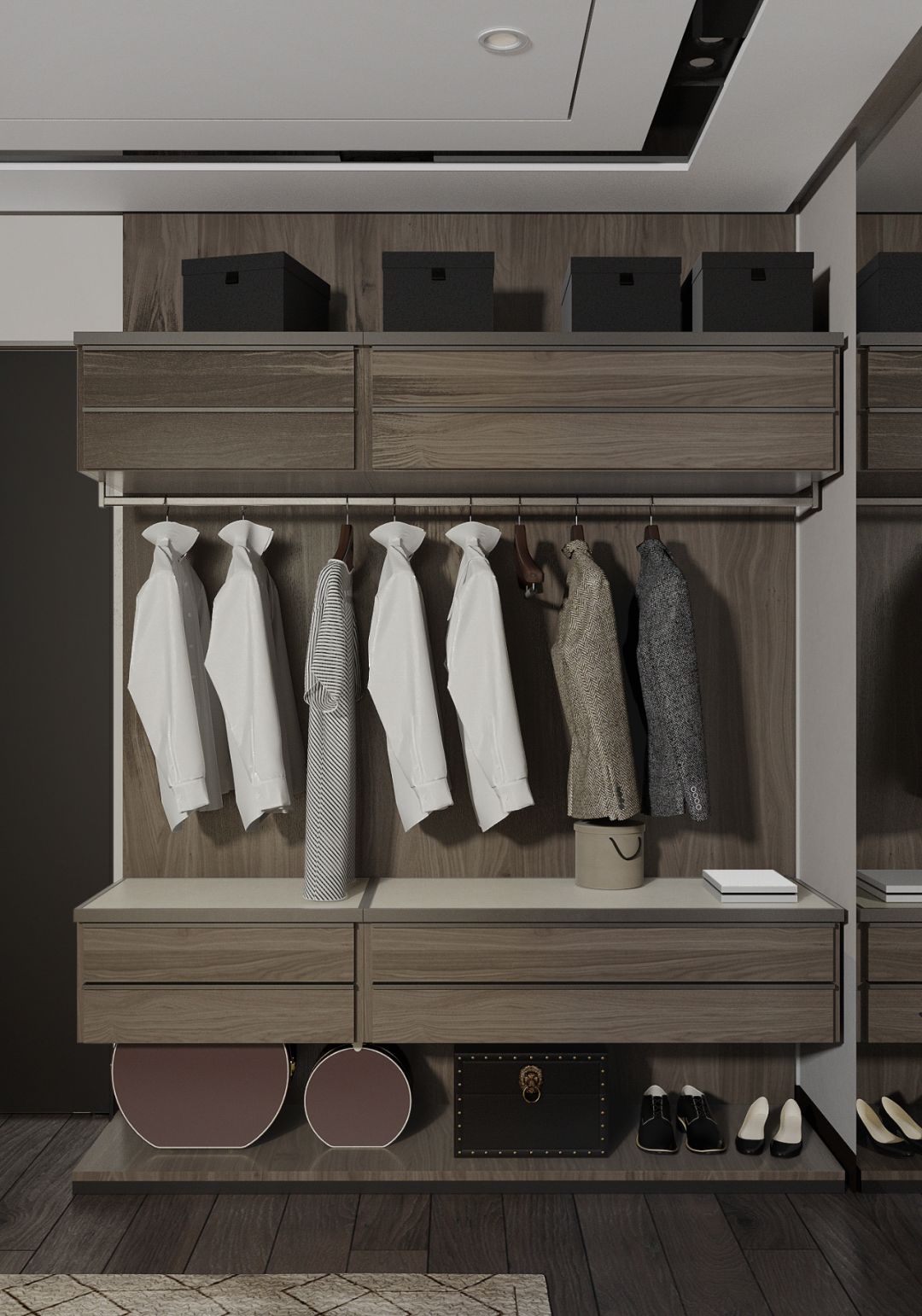 作为整个空间中最个人,最私密的地方,那一定就是衣帽间这个领地了。随着空间设计中,越来越会强调空间的实用性与