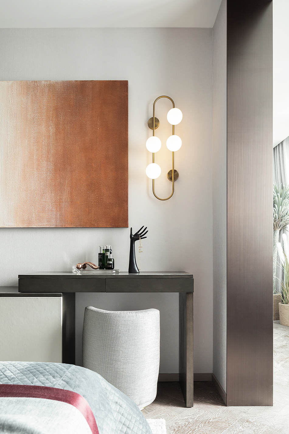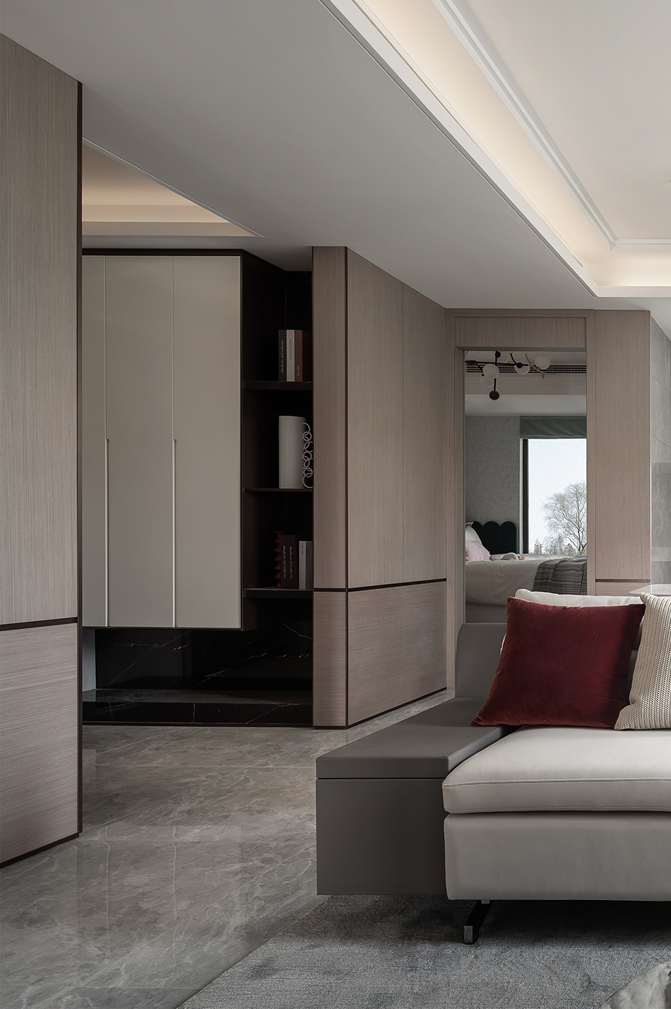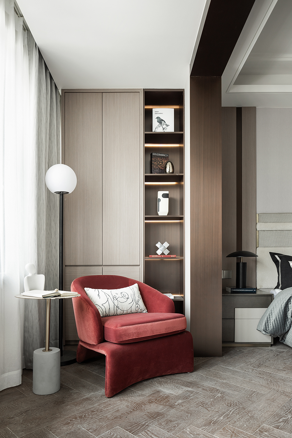 卧室的设计延续了客厅的用意,从墙体到软装,淡色调为主,不同灰度的色块组合拼接,搭配酒红色的布艺,格外醒目,精细车线工艺以及丝滑的材质尽显雍容大气。