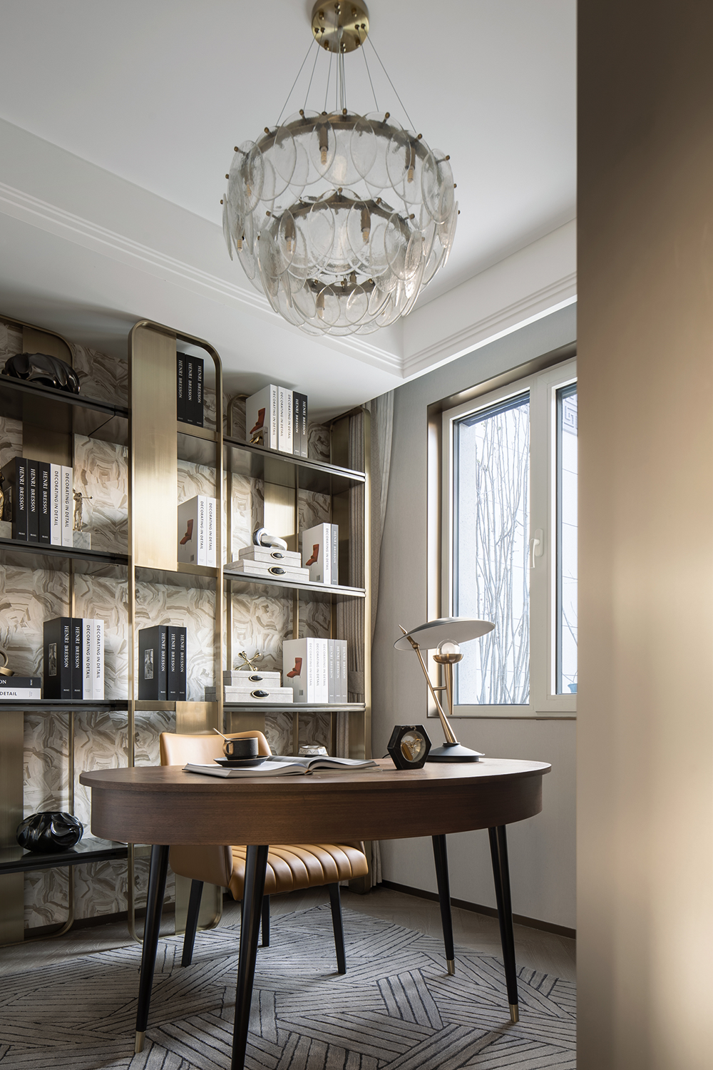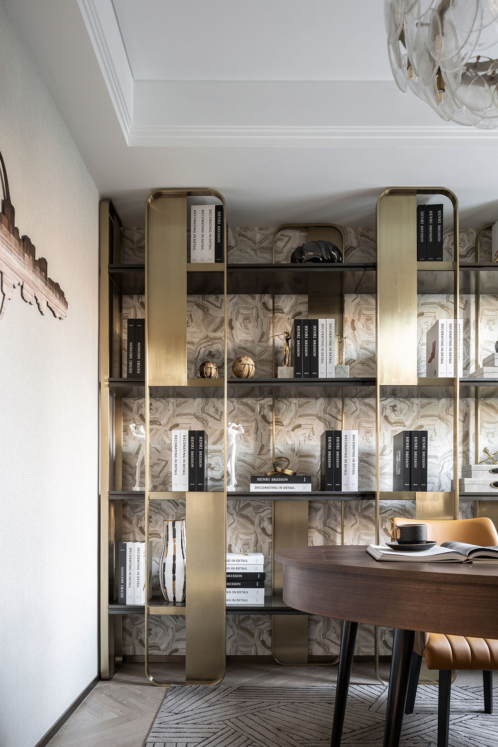 空间以金属、皮革的中性色调为主用色彩的纯度传递细腻的质感造型简洁线条流畅的家具组合搭配营造出稳定、协调、温馨的空间感受满足现代年轻家庭的轻奢需求