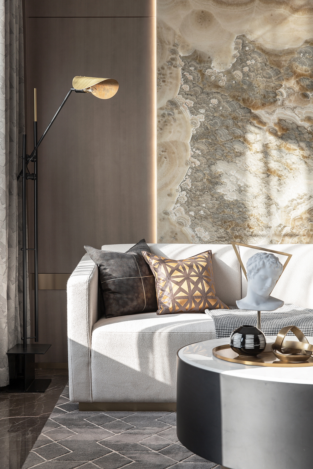 客厅沙发来自进口家具背景大花纹石材温润如泽,素雅质朴增添了空间的温馨与华丽气质