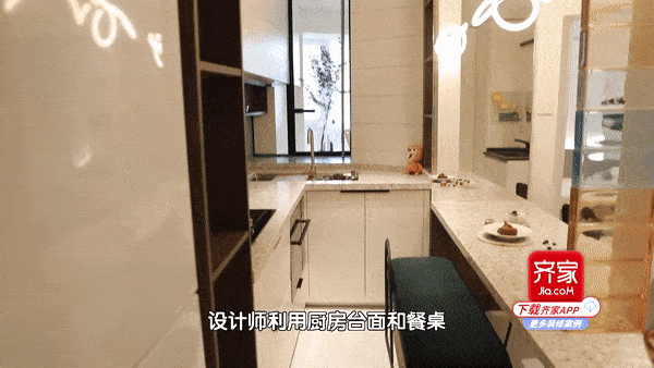 原来让人备感不适的刀把型拐角也被设计师利用厨房台面和餐桌消去了异形感,现在从门厅看过去,整个空间就是一个让人非常舒服的规则的矩形。