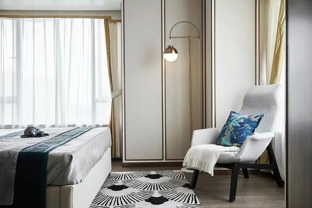 主卧风格以现代简约为主,依然是淡蓝色的墙体颜色,白色内纱搭配灰色窗帘,灰色大靠背床头,整个空间颜色交相呼应,给你清新淡雅的感觉。